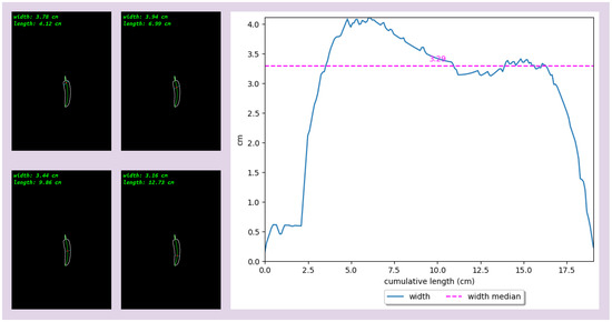 After obtaining the masks from the previous steps, we can measure the width and height of cucumbers from the obtained masks. The length of a cucumber is defined as the length of the predominant medial axis segment excluding the stem part (see Figure 5). However, defining the width of a cucumber is not straightforward, as there are an infinite number of lines perpendicular to the medial axis. Therefore, we propose profiling the width of cucumber by measuring it at various points along the medial axis , as shown in Figure 6. If a single value to represent the width of a sample is desired, we can use the median of width profile .