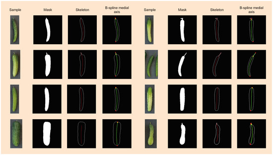 In Section 3.4, we discuss the limitations of morphological skeletons, which are clearly visualized in Figure 9. The morphological skeletons often do not intersect with the masks’ boundaries. Furthermore, they are sensitive to noise, resulting in skeletons with several branches and a lack of smoothness. In contrast, our utilization of B-spline medial axes yields a successful, closely fitted solution that effectively addresses the shortcomings of the morphological skeletons. Figure 9 also demonstrates the effectiveness of our proposed method in detecting the stem part of the cucumbers.
