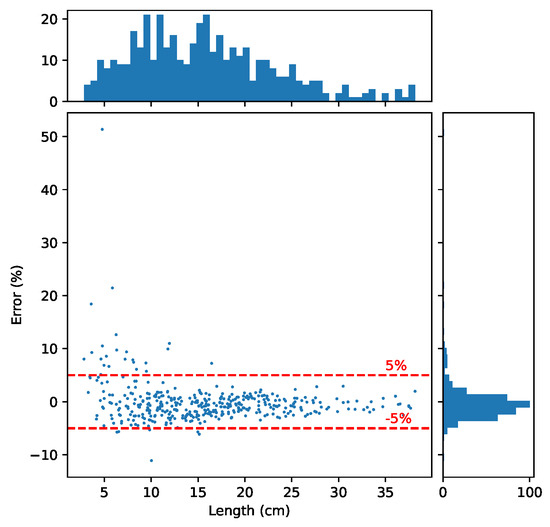 Error distribution on the test set. The histogram on top size shows the size in length distribution the samples. The histogram on the right size illustrates the distribution of the error (%). The main plot shows the relationship between the error (%) and the size of the samples.