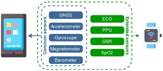 More recently, the development of “wearables” provides similar but new data-gathering platforms. On top of providing ultra-compact designs for the same sensors available on smartphones, smartwatches propose new kinds of sensors more related to health monitoring, such as ECG, photoplethysmogram (PPG), Galvanic Sensor Response (GSR), and/or SpO2. The different sensors in Android smart devices are displayed in Figure 1, showing the potential of smartwatches. While some manufacturers still propose their ecosystem (e.g., “ConnectIQ” for Garmin [3], Fitbit OS for Fitbit [4]), many manufacturers (e.g., Samsung, Google) are aligning on a common Android-based operating system with the possibility of common development of Android application on both the wearable and the smartphone platforms. This research will refer to them under the terms “smart devices”.