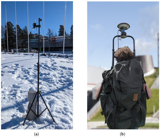 For a proper comparison of the devices’ capacities, we define our reference/baseline to compare the measurements. During the process of evaluating the positioning capacities of the receivers, the most obvious benchmarking method is to find the reference coordinates of the surveyed locations. For static surveys, this can be easily defined after or before the survey by surveying the static location with a high-grade GNSS receiver. To minimize device disturbances, we used a tripod as represented in Figure 3a. For dynamic surveys, we used a backpack with an antenna mount on top as represented in Figure 3b. The used receiver was a Novatel PwrPak7 receiver connected to a Novatel GNSS-850 antenna. For the trajectory computations, we opted for Differential GNSS (DGNSS) computations, using the backpack a rover and our local GNSS station located on the university rooftop (Novatel GPS-703-GGG antenna, Septentrio PolaRx5 receiver) as a base. The total baseline between the devices ranges from a few hundred meters to a few kilometres, depending on the scenario. The DGNSS computations were performed using the open-source software RTKLib [38]; as these computations were needed only for the reference dynamic tracks, the DGNSS algorithms are not a part of our MimirAnalyzer software at present.