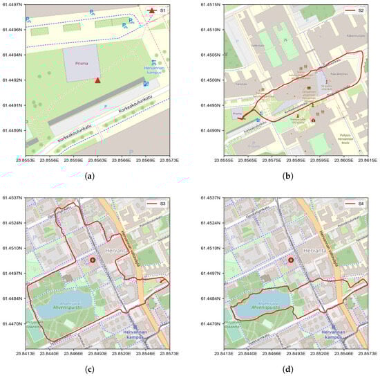 Maps of the scenarios’ trajectories. (a) S1; (b) S2; (c) S3; (d) S4.