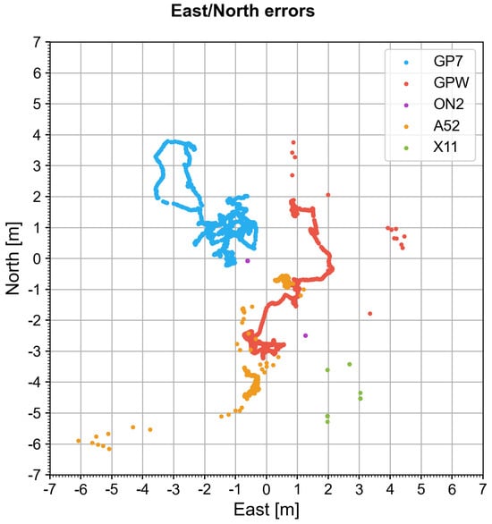 The second scenario is a short dynamic pedestrian acquisition (10 min), performed in heavy urban canyoning. The scenario starts and ends with a short (30 s) static acquisition over the landmark previously described in S1. This was performed to allow the convergence of the position and to ensure that every available signal was correctly tracked before the dynamic part started. The trajectory went from south to north. The southern part has relatively good visibility, with only some overpass bridges between the buildings. The northern part presents a very narrow alley between the buildings, with only a quazi-zenital sky view. The data were acquired separately, device by device, and the device was always placed in the right hand of the surveyor. The GPW was placed on the left wrist and acquired at the same time as the GP7, for comparison over the same GNSS chipset model. We used the backpack setup described in Section 3 as a reference receiver for each survey. Figures and statistics of the S2 survey are provided in Appendix C.