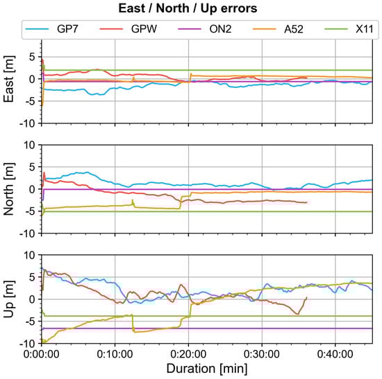 The Android API give access to different location providers, with different degrees of precision: NLP, Network Location Provider, related to the mobile network position (coarse precision); GPS, as provided by the GNSS chipset (standard precision); FSL, Fused Location Provider (best precision); in this paper, we focused on the GPS provider locations only, as provided by the phone. We did not perform any post-processing of the positions, nor computed the positions using advanced positioning techniques (e.g., sensor fusion, DGNSS, PPP). Instead, for positioning quality review, we computed the position errors in the east/north/up (ENU) direction, based on the reference receiver used in each scenario (see Section 3). These errors can be reviewed in two graphs, an overall map and ENU error against time, as well as statistic tables.