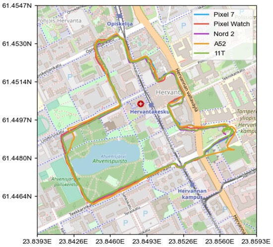 Wearables have the potential to expand the usage of data gathered in smart devices, bringing the health-related sensor dimension. Android smartwatches are based on a slightly different operating system (OS) than smartphones, called WearOS (formerly Android Wear). This OS is based on the same Android API levels, which allows for the common development of Android applications in both smartphones and smartwatches. WearOS 3.0 (Android 11) is the first version based on a higher version than Android 9, which should provide access to raw GNSS measurements. However, to the best of the authors’ knowledge, no paper until today has yet investigated the GNSS measurement quality of any Android smartwatch. Nevertheless, medical-oriented studies have shown the potential of wearables for medical research [27,28], as well as Android devices for contact tracing [29]. More specifically, in [30], the usage of indoor/outdoor positioning to retrieve the mobility patterns showed interesting results in recovering mental health assessment for patients. Thus, more accurate positioning and motion estimation could enable further medical research, especially if combined with the health sensors of smartwatches.