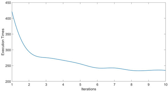 First scenario (baseline): In the first scenario, this study conducted simulation experiments to evaluate the performance of the proposed IoT data cloud jobs scheduling using modified distance cat swarm optimization. This baseline scenario involved a specific configuration with 120 jobs and 50 resources, and the optimization process was run for ten iterations. The execution time for each iteration was recorded and presented in Table 4 and Figure 3.