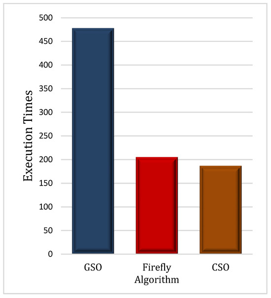 Table 7 and Figure 6 provide valuable insights into the performance of the proposed cat swarm optimization (CSO) mechanism when compared to two other well-established optimization algorithms, including the firefly algorithm (FA) and glowworm swarm optimization (GSO).