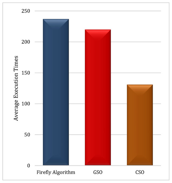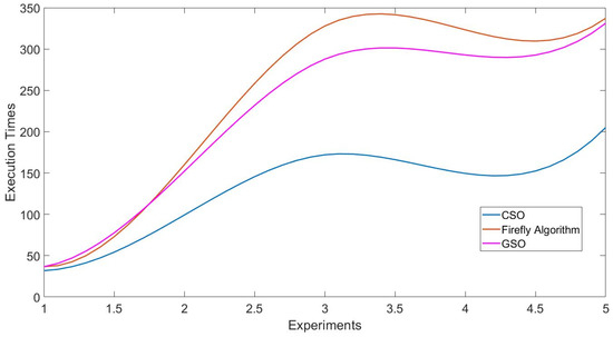 In summary, Figure 5 provides a comprehensive view of the comparative experimental results, highlighting CSO’s consistent superiority in terms of execution time over FA and GSO across varying scenarios. This information aids in understanding the performance dynamics of these optimization algorithms under different workload conditions.