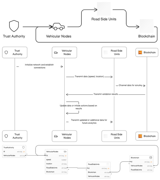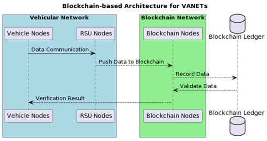 Blockchain technology’s application in VANETs extends beyond mere communication security [13,14]. It revolutionizes the entire ecosystem by enabling immutable record-keeping for vehicular history, thereby ensuring data integrity and fostering a transparent environment for data exchange. This immutable nature of blockchain technology is particularly pivotal, as it ensures that once vehicle data are recorded on the ledger, they cannot be altered or tampered with, thereby instilling trust in the vehicular data records [15].