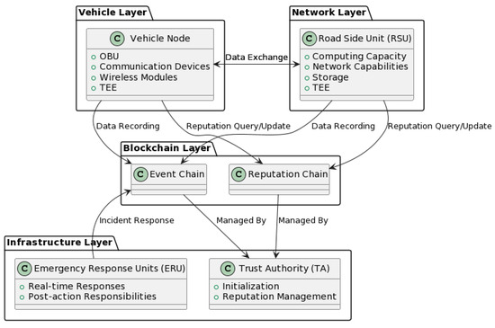 - Vehicle Node: Vehicles are furnished with an onboard unit (OBU) containing advanced communication devices, wireless transmission modules, and a trusted execution environment (TEE). These vehicles have adequate computational power to perform rudimentary calculations, such as road condition monitoring and trust evaluation based on received data [74,75]. Furthermore, they can partake in blockchain consensus mechanisms and execute queries on the blockchain.