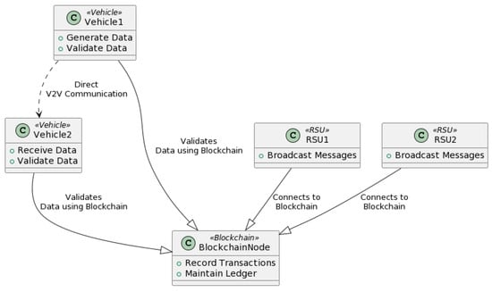 While we acknowledge RSUs as potential single points of failure, their presence in the system architecture is justified by the substantial benefits they offer in terms of network coverage, data aggregation, and performance enhancement. RSUs are strategically positioned to facilitate communication and data exchange between vehicles and the network infrastructure. They serve as pivotal relay points that extend the communication range, augment network robustness, and enable a broader dissemination of critical information, such as traffic conditions and safety messages. To mitigate the risk associated with a single point of failure, our proposed solution incorporates blockchain technology to decentralize data management and ensure redundancy. The blockchain operates as a distributed ledger that records all transactions and interactions, thereby not solely relying on RSUs for data integrity or network functionality. In the event of an RSU failure, the blockchain layer maintains continuous operation, thereby allowing vehicular nodes to communicate directly with each other or with alternative RSUs without disruption. Figure 3 illustrates the decentralized nature of the blockchain, thus enabling direct V2V interactions without necessitating RSU intermediation for every transaction.
