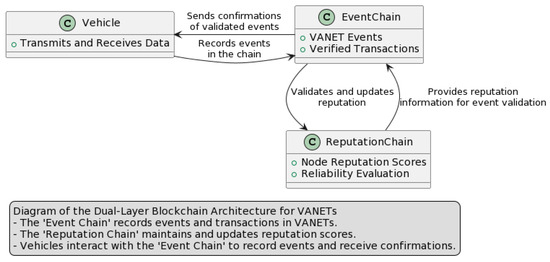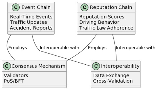 This layer employs two specialized consortium blockchains (see Figure 5) in a dual-layer blockchain architecture: the event chain and the reputation chain. The proposed architecture represents a significant innovation in managing security and efficiency in vehicular ad hoc networks (VANETs) [26,76]. RSUs and selected vehicles with surplus computational capacity are chosen to engage in the blockchain consensus process.