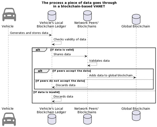 Integrating blockchain technology can alleviate some of these concerns [16,17]. The decentralized nature of the blockchain ensures that no single point of failure exists, thereby enhancing the robustness and resilience of the system [18]. Every transaction, in this case, vehicle certifications, can be recorded on the blockchain, thus making the data tamper-proof and ensuring its integrity. Moreover, the blockchain’s consensus mechanisms can be leveraged to validate vehicle entries, thereby reducing the burden on a single RSU and distributing the task across multiple nodes or participants in the network. This not only streamlines the certification process, but also introduces an added layer of security, thus making it exceedingly difficult for malicious actors to compromise the system.