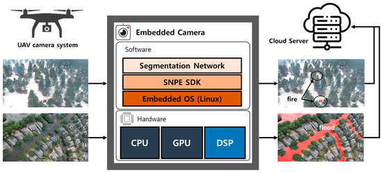 As shown in Figure 1, the proposed system consists of acquiring aerial images with a camera mounted on a UAV, running a semantic segmentation network stored in the memory of the embedded camera device on a DSP to detect forest fires or floods, and finally notifying the ground station of the detected results.