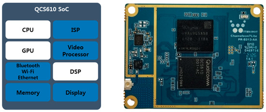 A Qualcomm QCS610 chip contains three cores: the Kyro 460 CPU, Adreno 612 GPU, and Hexagon 685 DSP. Figure 3 shows the block diagram of the chip and the embedded board developed by WITHROBOT Inc. Its size is 5 cm wide and 3.8 cm long.