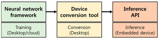 Executing deep learning-based AI models on edge devices typically requires three steps, as shown in Figure 4. Train a DNN model on the neural network framework of the GPU system on the desktop and convert the trained model to a format suitable for the embedded environment by utilizing the device conversion tool. Finally, import the converted model into the embedded device and run it through the inference API.