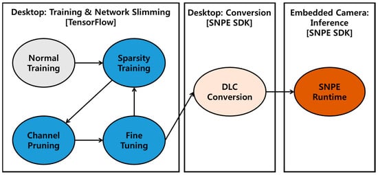 Figure 5 shows the process followed in this paper. First, we create a lightweight semantic segmentation network through network slimming in the TensorFlow framework. Network slimming is a type of network lightweight, which is a way to optimize a network to have a suitable size and computation for resource-constrained edge devices. Network slimming consists of sparsity training, channel pruning, and fine-tuning, as shown in Figure 5, and is described in detail in Section 4. Next, we utilize the inference API (SNPE SDK) provided by Qualcomm to convert the slimmed network into a Deep Learning Container (DLC) file, a format suitable for the QCS 610 embedded board environment. This DLC file stores model parameters in floating point format and runs only on processors capable of 32-bit floating-point operations. However, DSPs only support 8-bit integer operations, so parameter quantization is required. Quantization methods include Post Training Quantization (PTQ) and Quantization Aware Training (QAT) [28]. PTQ is a method that quantizes parameters after network training. QAT is a method that simultaneously finds the optimal parameters and quantizes them by simulating the effect of quantization in the inference during training. This paper applies the PTQ provided by the SNPE tool to convert the DLC model with 32-bit floating-point parameters to the one with 8-bit integer parameters. Finally, the quantized DLC file is imported into the embedded board, and its inference is executed on the board.