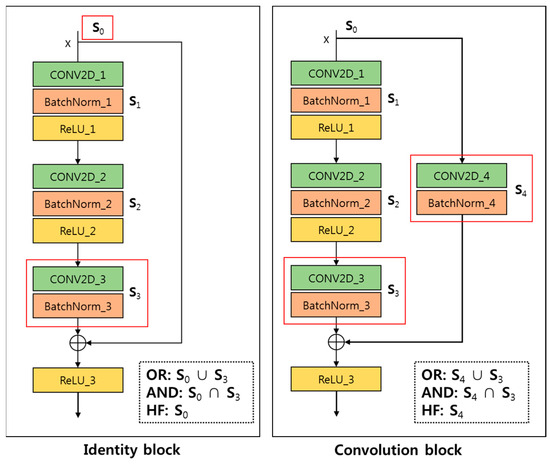Next, we apply channel pruning to the sparsity trained network. Once the target pruning ratio (R) is determined, the number of channels to be removed (N) is calculated as the product of the pruning ratio (R) and the total number of channels (K) of the network. The global threshold is then selected as the (KxR)th value after sorting the scaling factor values for all channels in descending order, and unnecessary channels are pruned based on this threshold. When pruning channels using a global threshold, the number of channels removed and location (index) of the channels are different for each layer. In the case of a network with a sequential structure, there is no problem in pruning the network even if the number of channels removed or their positions vary from layer to layer. However, it causes a problem in the networks with residual blocks due to add operations of skip connections. In order to apply channel pruning to add operations in this network, the number of pruned channels between the two convolutional layers connected to the add layer must match, and the positions of the channels being pruned must be the same. There is a simple method that is commonly used to solve this problem [29]. First, find the index set of channels to be retained in each convolutional layer that needs to be matched. Next, apply OR, AND, or Head-First (HF) mode between the different index sets to be matched. The OR and AND modes prune channels of the related Convolutional layers equally using the results of applying logical sum and logical product operations to multiple index sets, respectively. HF mode prunes channels of all remaining Convolutional layers equally by utilizing the index set of the Convolutional layer immediately before the residual block. The residual blocks of ResNet used in this paper include the identity and convolution blocks. Figure 6 illustrates how to apply channel pruning in the identity and convolution blocks, where Si denotes the set of indices of the necessary channels to keep in the i-th Convolutional layer. As shown in Figure 6, in the case of the identity block, we need to match the channel index (S0) of the Convolutional layer (conv2D_0) that enters the residual block with the channel index (S3) of the Convolutional layer (conv2D_3) placed immediately before the Add layer. Similarly, in the convolution block, channel pruning is performed by matching the channel index of the two Convolutional layers (conv2D_3 and conv2D_4) placed just before the Add layer.