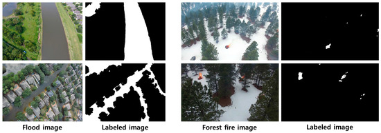 In the experiments, we used two benchmark datasets collected by UAVs such as drones: FloodNet [30] for floods and FLAME [31] for wildfires. FloodNet [30] consists of aerial imagery collected by DJI Mavic Pro quadcopters, a small UAV platform, after Hurricane Harvey in 2017 near Texas and Louisiana. This dataset reflects actual flood situations and includes 2343 high-resolution (4000 × 3000) images taken at a low altitude of 200 feet above the ground. Ground-truth images are labeled pixel-wise for nine different classes: building-flooded, building-non-flooded, road-flooded, road-non-flooded, water, tree, vehicle, pool, and grass. In this paper, the goal is to detect floods, not to evaluate the damage caused by floods, so we reset to two classes: water and background. ‘building-flooded’, ‘road-flooded’, and ‘water’ belong to the water class, and the rest of the classes belong to the background class. Also, we excluded 476 incorrectly annotated images and conducted the experiments with the remaining 1867 images. The dataset split was 1146 for training, 351 for validation, and 370 for test. FLAME [31] is a dataset collected for early detection of forest fires. This dataset consists of aerial imagery captured by a camera mounted on a drone after stacking burning piles at a predetermined location to simulate an earlier forest fire. Among the various datasets in FLAME, we experimented with a dataset consisting of 2003 still images acquired with a general camera and annotated images labeled pixel-wise as fire and background. The image resolution is 3480 × 2160, and the dataset split was 1503 for training, 200 for validation, and 300 for test. Figure 7 shows examples of aerial images and labeled images from FloodNet and FLAME.
