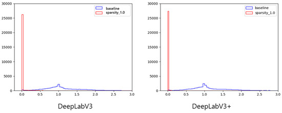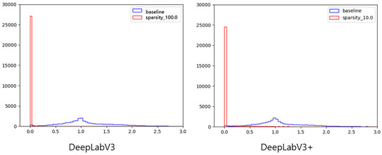 This section summarizes the performance evaluation results of DeepLabV3 and DeepLabV3+ on the FloodNet dataset. Table 4 shows the performance of the baseline model and the sparsity trained model for both networks. For the sparsity trained model, the sparsity parameter was chosen as described in Section 5.2 and set to 100.0 and 10.0 for both networks, respectively. Figure 10 shows histograms of the channel’s scaling factors for DeepLabV3 and DeepLabV3+. These histograms display that after sparsity training, the channel scaling factors are clustered around 0.0, which indicates adequate sparsity training results.