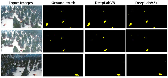 Figure 9 shows the semantic segmentation results obtained by the DSP. The columns in the figure show the input image, the ground-truth image labeled as fire, the image inferred by DeepLabV3, and the image inferred by DeepLabV3+. For both models, we can see that both large and small fires are segmented well compared to the ground truth.