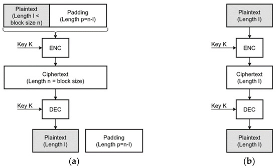 (a) Block cipher encryption vs (b) Format-preserving encryption of plaintext of length l.