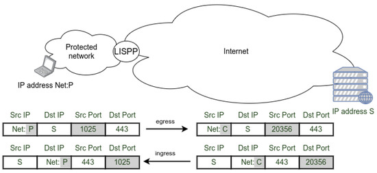 LISPP processes packets at the network boundary. It encrypts the host part of the source IP address and source port in packets that exit the protected network and decrypts them in the opposite direction. In the egress direction, the host part of the original source IP address from the protected network (designated as P—plaintext in Figure 2) and source port are replaced with their encrypted values (designated as C—ciphertext and new port number). The network part of the IP address (Net) remains the same, ensuring proper packet routing back to the protected network. In the ingress direction, decryption using the same key is performed, restoring addresses and ports to their original values.