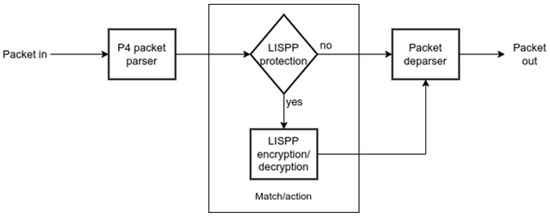 In both directions, after packet parsing and checksum verification, LISPP filters packets which will be processed (Figure 3). Since LISPP uses a source port as a part of the plaintext in the egress direction, LISPP can be used to protect any TCP or UDP packet. However, it is possible to program the match filter to push to the encryption phase packets with any specific destination port value (e.g., TCP 443 for TLS or UDP 53 for DNS requests/responses) while all the other packets pass the system unchanged.