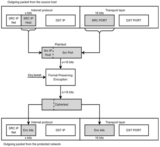 Figure 4 shows how LISPP encrypts the packet header elements using FPE. The host part of the source IP address and source port are concatenated and encrypted using a secret key. Since FPE is used, n bits of plaintext are encrypted into exactly n bits of the ciphertext regardless of the number of bits n. In that case, it is possible to obtain a reversible one-to-one mapping between the (src IP, src port) and (enc(src IP), enc(src port)) pairs regardless of the network mask size (and IP version). It is possible to achieve fully transparent and stateless operation in both directions.