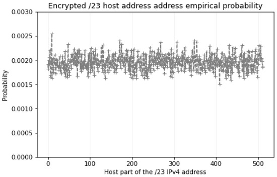 An illustration of LISPP address obfuscation in operation is given in Figure 5. This figure shows the empirical probability of the appearance of encrypted values of host parts of the IP address (enc(src IP)) obtained from a single source IP address with mask /23 and the full range of source ports from 0 to 65,535. Visual inspection shows that LISPP achieves uniform distribution of the encrypted source IP addresses across all possible 512 values of a 9-bit host part of the address. More rigorous randomness testing is presented in Section 5.