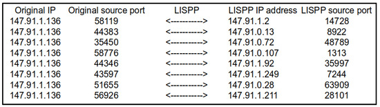 One clear use of LISPP is to mitigate the threat of private information leakage and user profiling by public DNS resolvers (e.g., Google Public DNS: 8.8.8.8, Quad9: 9.9.9.9, Cloudflare: 1.1.1.1 and similar). DNS resolvers receive the set of symbolic names of sites a user visits regardless of how symbolic names are sent to the resolver (encrypted by DNS over TLS or HTTPS or in plaintext). Therefore, for a user behind the specific IP address, DNS resolvers can gather information about the interests and the sites visited. There were some previous attempts to hide the symbolic names from the public resolvers by encrypting and encapsulating them into the regular DNS queries and redirecting them to another resolver [23]. By varying the source IP address for each user’s DNS request, LISPP successfully disables such profiling, and the system is significantly simpler than the previous solutions. The ISP can offer LISPP as an additional privacy protection service that prevents third parties (external sites and services) on the Internet from tracking the users and analysing their behaviour on the network layer. An example of LISPP performing DNS request source obfuscation is given in Figure 6. This figure shows eight consecutive DNS requests from a single computer in a /23 network and the set of addresses and ports to which LISPP converted the original data. It is evident that for the DNS server operator, it is difficult, if not impossible, to tell which device it is talking to at any given time. The effect of using LISPP would be the same for any other network protocol (e.g., web, SSH, FTP, etc.).
