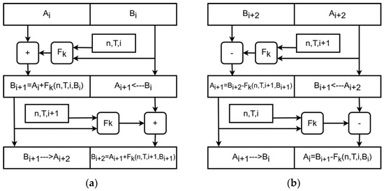 The FF3-1 achieves greater throughput because it has eight rounds, two fewer compared to the FF1, while the FF1 supports a wider range of lengths for the plaintext and flexibility in the tweak length [9]. Since per-packet processing time should be as low as possible, we focused on the FF3-1. In the core of each FF3-1 round is an approved block cipher used as a round function (Fk) to create a pseudorandom output. Figure 7 shows two Feistel rounds of FF3-1 encryption and decryption. Plaintext input is divided into two parts (Ai and Bi), which have the same size in case of an even number of plaintext characters or differ in size by one character in case of an odd number of plaintext characters. In our case, one character corresponds to one bit because packet header fields are binary words. The second part (Bi) is copied into the first part of the next round (Ai+1), while the first part is added to the output of the Fk round function. The inputs to the round function are one part of the previous block, round number i, random tweak T and the plaintext size n.