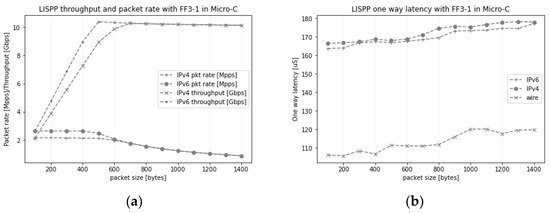(a) The number of packets per second the LISPP system can process for IPv4 and IPv6; (b) Per-packet one-way latency.