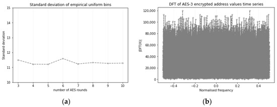 (a) The standard deviation of empirical frequencies of appearance of all possible encrypted IP addresses in the 9-bit address range for varying numbers of AES rounds; (b) DFT magnitude of an encrypted address series obtained using FF3-1 with 3-round AES.