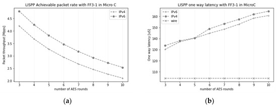 In the third batch of performance tests, we analysed the potential packet rate increase by reducing the number of FF3-1 rounds. We pushed 10,000,000 100-byte packets per second through the LISPP system and measured the number of packets that arrived on the sink side. Figure 11a shows the number of packets the system can process per second. The entire FF3-1 implementation in Micro-C can process more than 2 million packets per second, while the packet rate can be almost doubled using 3-round AES as a round function. It is interesting to notice that the network interface card achieved higher packet rates for IPv6 packets, which is probably a consequence of the simpler IPv6 header processing in the card (no header checksum).