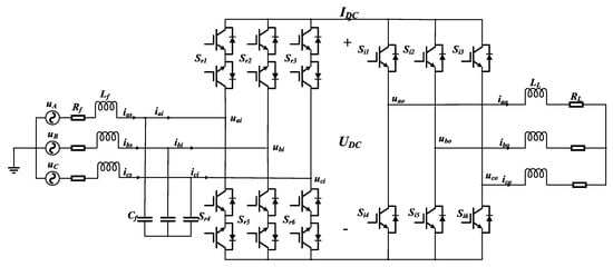 With the development of power electronics and computer control, research on matrix converters (MCs) has been receiving increasing attention. MCs are advanced topology power converters, which have the advantages of a simple topology, no intermediate energy storage links, low harmonic pollution to the grid, a sinusoidal input current and output voltage, an input power factor of 1, an adjustable output voltage amplitude and frequency, a bi-directional energy flow, etc. [1]. It has been proposed that MCs should be used in motors by adopting an indirect control technique, which reduces the switching losses, and should be applied in hospital pumping or vehicle applications [2].