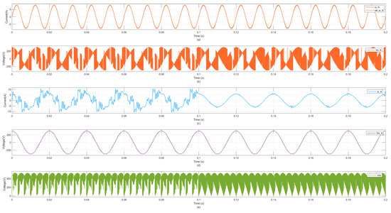 Based on this, the IMC is modeled using a power device, namely the Simulink power system (SPS) library, in Matlab R2022b Simulink. The offline simulation results are shown in Figure 3. In order to evaluate the results of instantaneous reactive power minimization, the system does not consider reactive power tracking before t = 0.1 s, i.e., the cost weight of the reactive power is 0, and the weighting is equal to 1 after t = 0.1 s. Figure 3a,b shows the output current, , and output voltage, , of phase A; Figure 3c,d shows the input current, , and input voltage, , of phase A; and Figure 3e shows the DC bus voltage. Only the output current is tracked; thus, the reactive power is in an oscillating state, and after 0.1 s, the instantaneous reactive power is almost zero.
