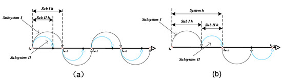 The use of latency-free decoupling with multiple subsystems, where each subsystem does not have a beat delay and does not lose precision, can effectively reduce the matrix dimension and reduce the computation amount. Additionally, as shown in Figure 4a, after including latency-free decoupling in the operation process, the two subsystems are used in parallel operation and the system waiting time is determined by the two subsystems in the single largest subsystem simulation time step; meanwhile, for the conventional delayed decoupling method shown in Figure 4b, the subsystem execution can only be started after the completion of subsystem I execution. This leads to the overall system simulation time being equal to the sum of the two subsystems’ simulation time steps. It can clearly be seen that latency-free decoupling can effectively reduce the simulation time steps.