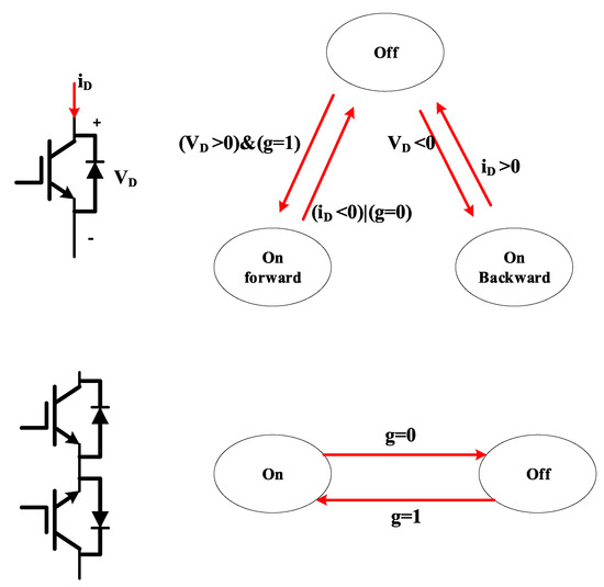 In the modeling process, the update rule of the switch state directly determines whether the switch state is accurate or not. Taking an IMC as an example, in this paper, specific judgment conditions are presented for the switch state of the two switch types, alongside an IGBT with an anti-parallel diode and a double-series anti-parallel diode IGBT, as shown in Figure 7. As both are active switching devices, the switching state update should be determined by the voltage v at the terminals and the current i flowing through it, in addition to the extra external control signal g. Therefore, for an IGBT with an anti-parallel diode: