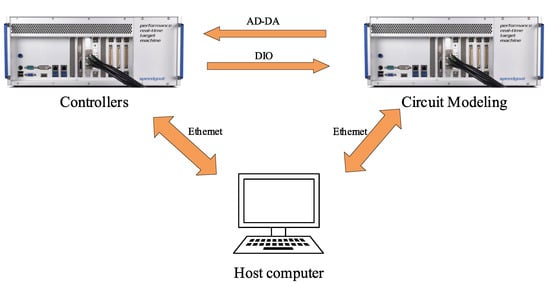 The specific environment of the experiment is shown in Figure 11, where (1) is the host computer for operation and control, (2) is the oscilloscope which can observe the output waveforms in real time, (3) is the Speedgoat 1 simulator, which carries out real-time simulations of the circuit model in the internal FPGA and (4) is the Speedgoat 2 simulator, which runs the control algorithm in the CPU environment. The information is extracted through the analogue and digital boards ((5) and (6)).