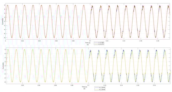 As shown in Figure 12a below, the output current of the load-side A-phase output of the SPS model and latency-free decoupling model is shown. The average error of the waveforms of the latency-free decoupling model and the SPS model is 0.01% before 0.1 s, and the average error is 0.03% after 0.1 s. The results of serial simulation with SPS are shown in Figure 12b. The average error is 0.01% before 0.1 s, and the average error is 4.5% after 0.1 s.