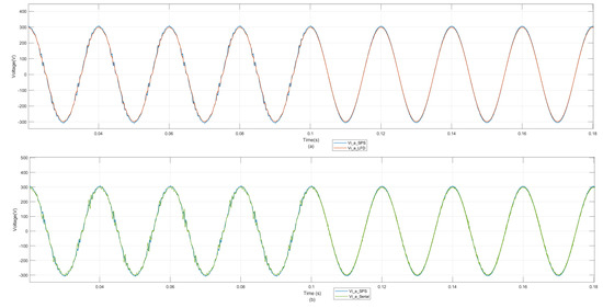 The input voltage of phase A of the power supply side for the SPS model and the latency-free decoupling model is shown in Figure 13a below. The average error of the waveforms of the latency-free decoupling model and the SPS model is 0.02%. The serial simulation with SPS is shown in Figure 13b. The average error before 0.1 s is 3.4%, and the average error after 0.1 s is 2.7%.