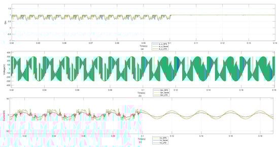 In order to verify the modeling accuracy, we first simulated the model on the FPGA board using the LDF and serial decoupling methods, with both adopting the same simulation parameters as SPS, as shown in Table 1. At the same time, in order to verify the model accuracy, the same control algorithm (FCS-MPC) was adopted, so that the error only resulted from the method proposed in this paper. The LDF model, serial decoupling model and Simulink power system (SPS) model are compared, respectively, and the output current , input voltage, , and instantaneous reactive power, , are analyzed. At the same time, in order to verify the effect of instantaneous reactive power tracking of FCS-MPC, the instantaneous reactive power was not tracked before t = 0.1 s (instantaneous reactive power tracking started after t = 0.1 s).