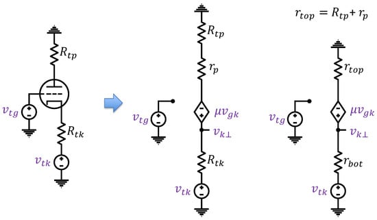 For convenience, we define , and for consistency, we define , as shown in the rightmost diagram in Figure 1. We find it illuminating to consider a Thévenin equivalent circuit found looking into the negative terminal of the VCVS and not the top of ; hence, although we find equivalent circuits looking into the cathode, we do not strictly find equivalent circuits looking into the plate. We imagine that we can access an “inner plate” between and the VCVS; this shortens the description of the Thévenin equivalent, but one needs to remember to add .