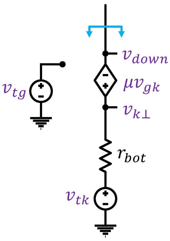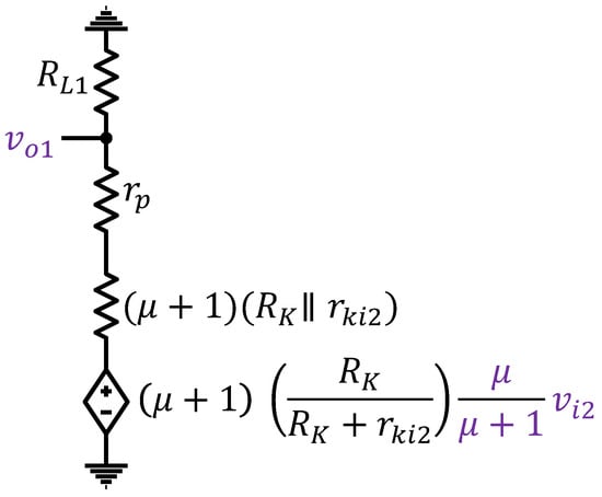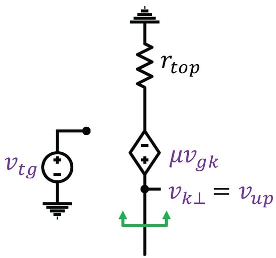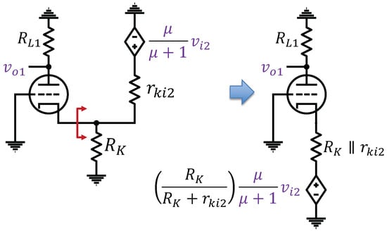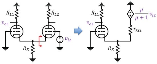 We can now find the Thévenin equivalent circuit seen looking into the plate, as visualized in Figure 13. According to Figure 4, the resistance () when seen from the other side tube appears as , which is in series with the dynamic plate resistance (). Similarly, the voltage () is multiplied by .