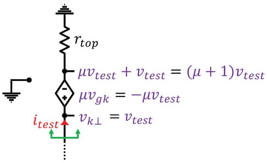 To compute the equivalent resistance seen looking up into the positive terminal of the VCVS, we zero the independent source (); introduce an independent test voltage source (), as shown in Figure 6; and compute the resulting . Since , we can compute the voltage at the negative terminal of the VCVS as . Hence,
