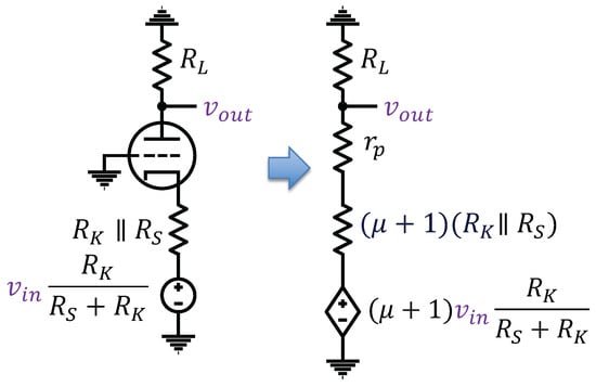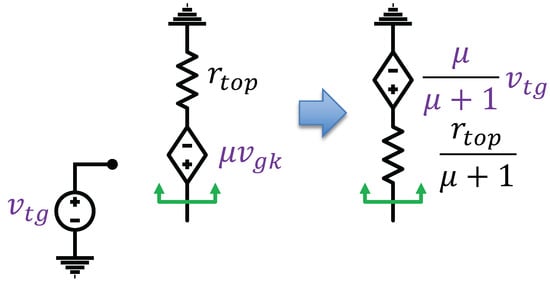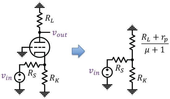 The left diagram in Figure 9 shows the underlying small-signal model replacing the triode symbol in the right diagram of Figure 8. This forms the basis of the usual analysis of the amplifier, as may be found on pp. 39–41 of []. Skipping the small-signal model and applying the Thévenin equivalent in Figure 4 yields the right diagram of Figure 9, which permits a more direct solution via voltage division: