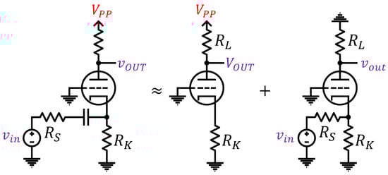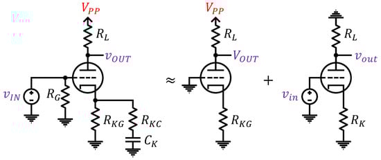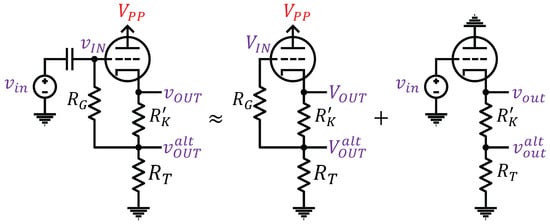 The left diagram in Figure 8 shows a typical self-biased common-cathode amplifier (based on Figure 5.7 of []). The input at the grid is ground-referenced via the grid leak resistor (), so . denotes a resistor connecting the cathode to ground, and denotes a resistor connecting the cathode to the capacitor (). We refer to the plate resistor as instead of to avoid confusion with the notation for the dynamic small-signal plate resistance (). “L” in this context stands for “load”, but this should be thought of as part of the amplifier and not as representing an external load.