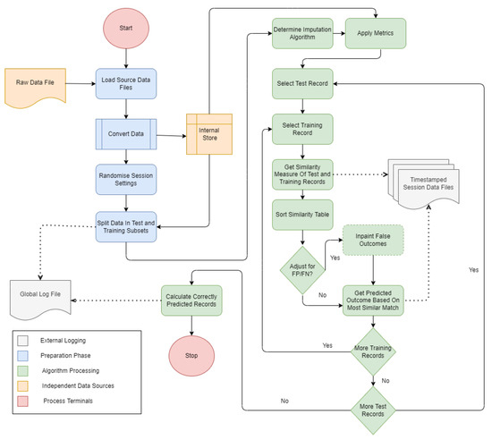 Considering the process diagram shown in Figure 1, the similarity modeling process is split into two main subflows. The colors used are unimportant and just used for highlighting purposes. The blue flow describes the processing steps of loading external data and standardizing it into a form that can be used by the second (green) flow through the application of the k-fold technique to split the source data set into folds. The green flow indicates the application of the N-Similarity algorithm. The key points of the algorithm flow are to take each fold as a test record in turn and apply cross correlation against each of the remaining training folds to generate the similarity table of the most similar training records for each record in the test fold. This is repeated for each training record until all comparison combinations have been performed. For each incomplete record, the missing feature value is determined by considering the properties of the closest records in the similarity table, and a candidate is selected based on a number of rules and criteria. The results of these comparisons are shown in Table 1.