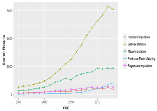 Some analysis has been undertaken [42] to determine the most popular imputation methods since 2000 (Figure 2). Popularity has been measured based on the number of times each imputation algorithm is mentioned in Google Scholar articles and papers. The results are somewhat surprising, since simpler, older techniques seem to be more popular than more recent approaches: